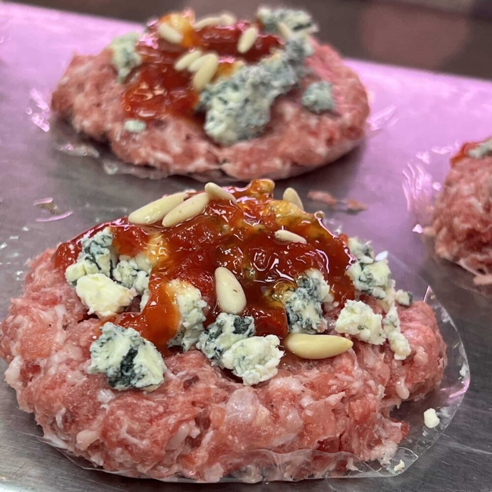 Hamburguesa de solomillo de vaca, queso azul, confitura de pimientos de piquillo y piñones.