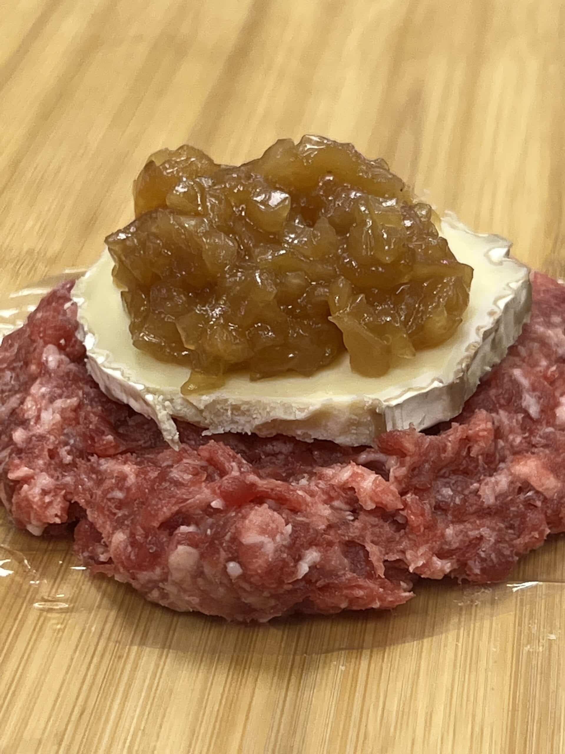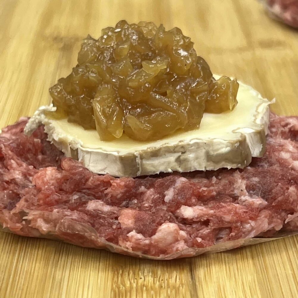 Hamburguesa de solomillo de vaca, rulo de cabra y cebolla caramelizada.