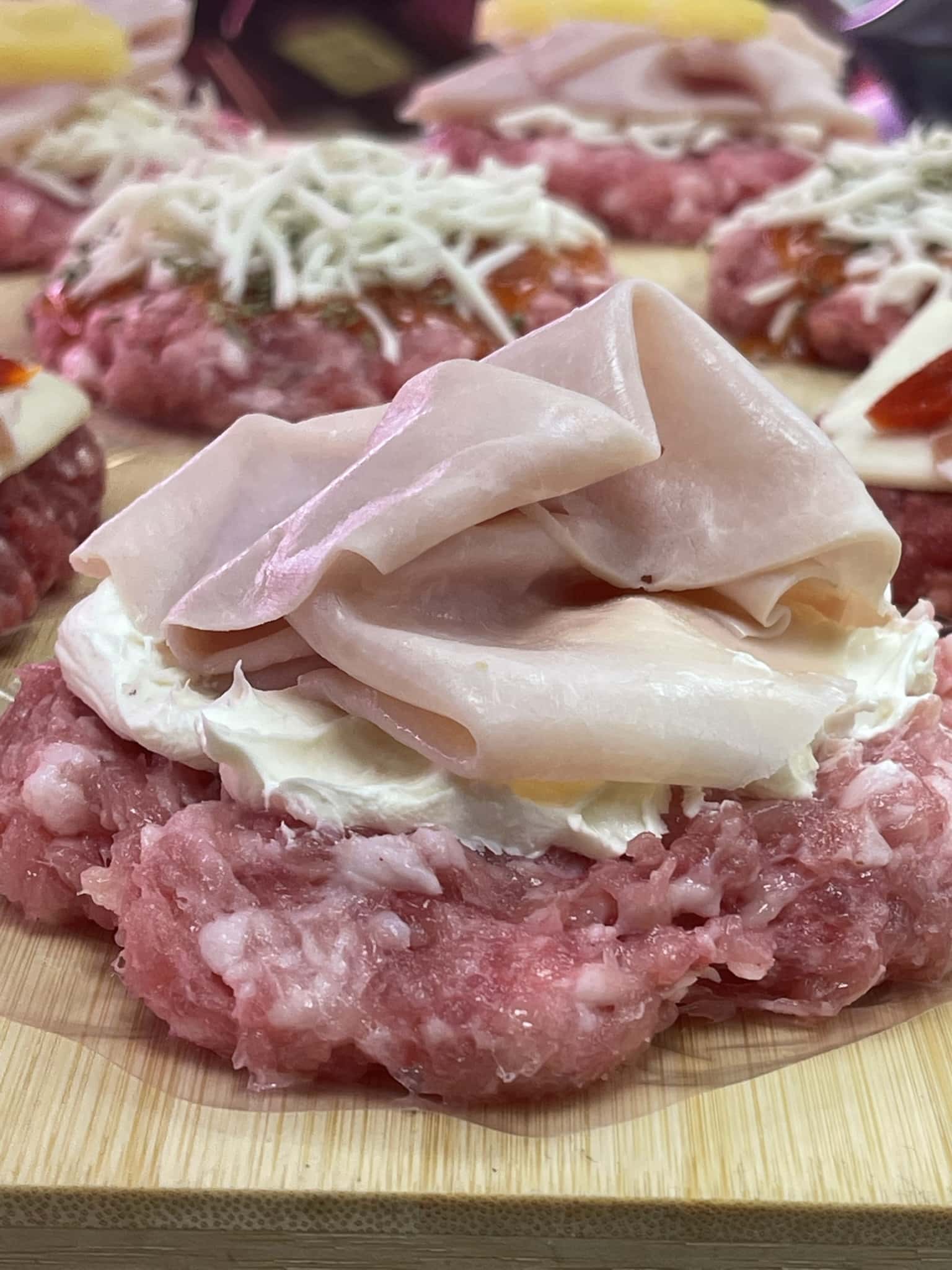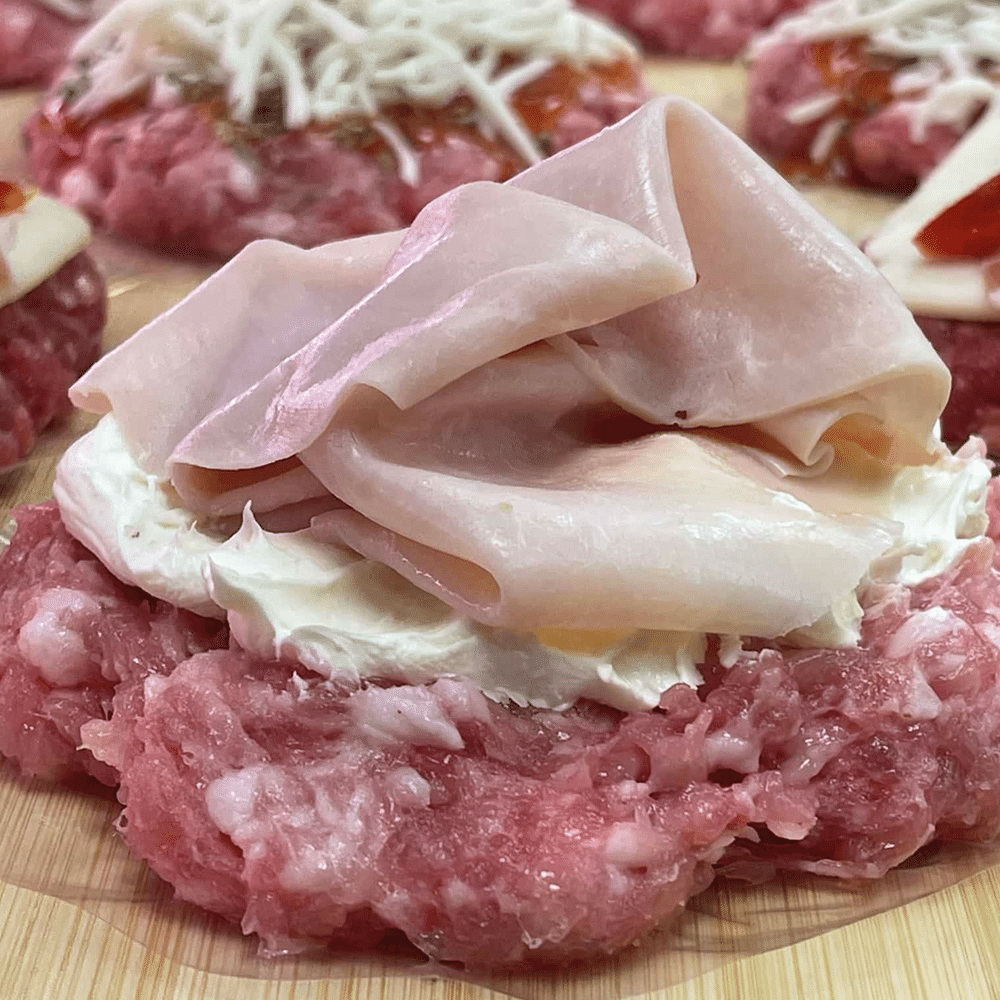 Hamburguesa de pollo, queso philadelphia y jamón de york.