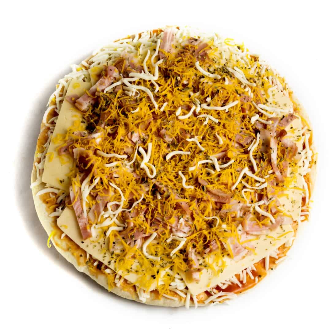 Pizza de tomate, mozzarella, queso edam, bacon y queso cheddar rayado.